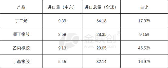 以上统计数据显示,乙丙橡胶、丁二烯、丁基橡胶、顺丁橡胶自中东国家具有一定的进口,特别是乙丙橡胶和丁二烯,具体影响分析如下:
